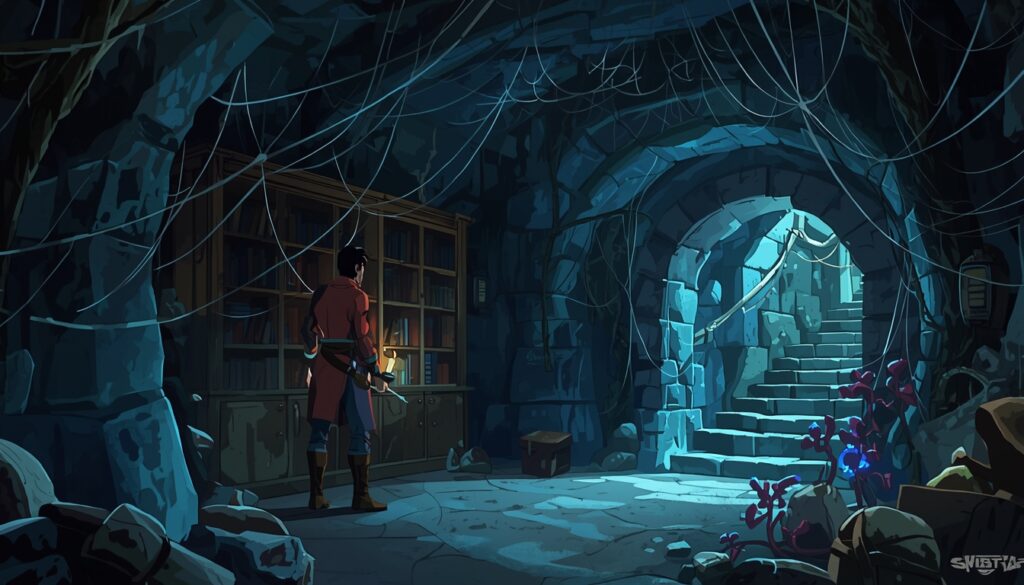Solaris taps his back with the base of her torch, and the martial artist leads her and the rest of their party into another dark room. The floor is dusty instead of damp and webs cover the walls all the way up to the ceiling, a tree’s height above Solaris.