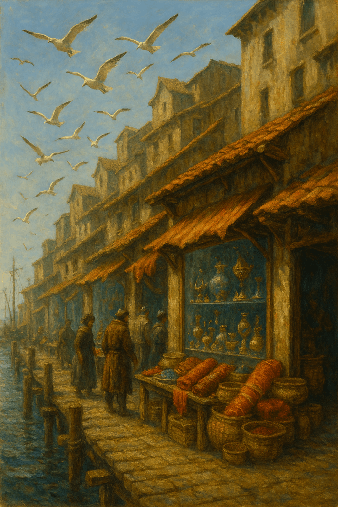 Seagulls squawk and soar over the city’s slumside docks. Under new management, boards have been removed from storefront windows, replaced with trade goods displayed behind glass. Shiny trinkets, silk, and spices instead of empty bottles, drugs, and darker vices.