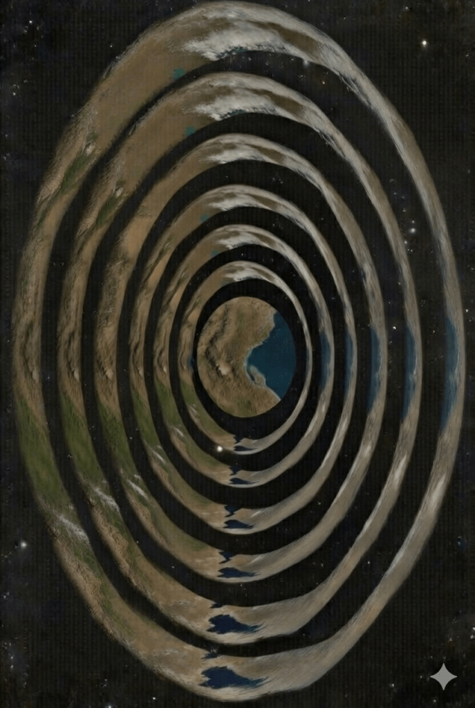 Precision Geometry Prompt (Structure First)A colossal monolithic megastructure floating in deep space.The structure is composed of exactly nine solid concentric components sharing a single central axis:1 central solid disk and 8 surrounding rings.The central disk is 1,200 miles in diameter and exactly 1 mile thick.Surrounding it are eight perfectly concentric rings.Each ring is exactly 600 miles wide (radially) and exactly 1 mile thick.There are NO gaps between rings.Each ring directly touches the next one.The structure forms a continuous stepped radial expansion outward.If each ring were filled into a solid disk, the diameters would be:2,400 miles3,600 miles4,800 miles6,000 miles7,200 miles8,400 miles9,600 miles10,800 miles (outermost boundary)The outermost diameter of the structure is exactly 10,800 miles.All components rotate in the same direction around the central axis.The central disk rotates at base speed.Each ring doubles the angular velocity of the previous layer:2×, 4×, 8×, 16×, 32×, 64×, 128×, 256×.The different rotation speeds are visible through distinct motion blur levels for each ring.The structure is a seamless dark metallic monolith with sharp edges and precise geometry.Orthographic or slightly angled perspective to clearly show the full concentric structure.No Saturn-like thin rings.No gaps.No floating separated bands.Solid radial construction.The rings are thick solid bands like stacked architectural layers, not thin planetary rings.